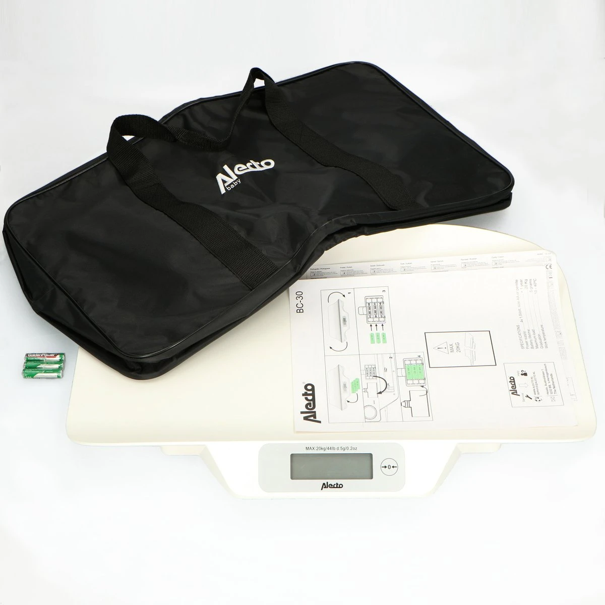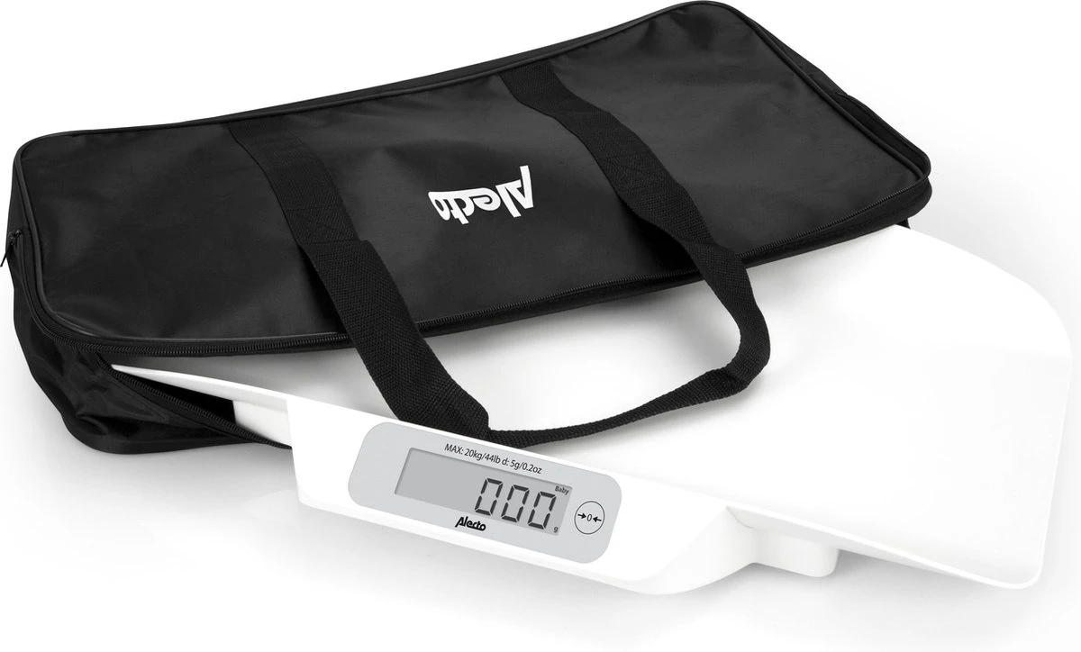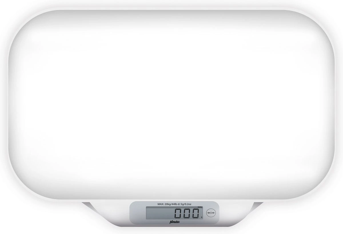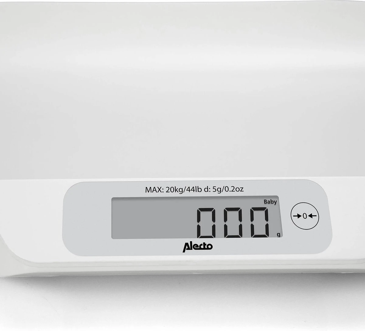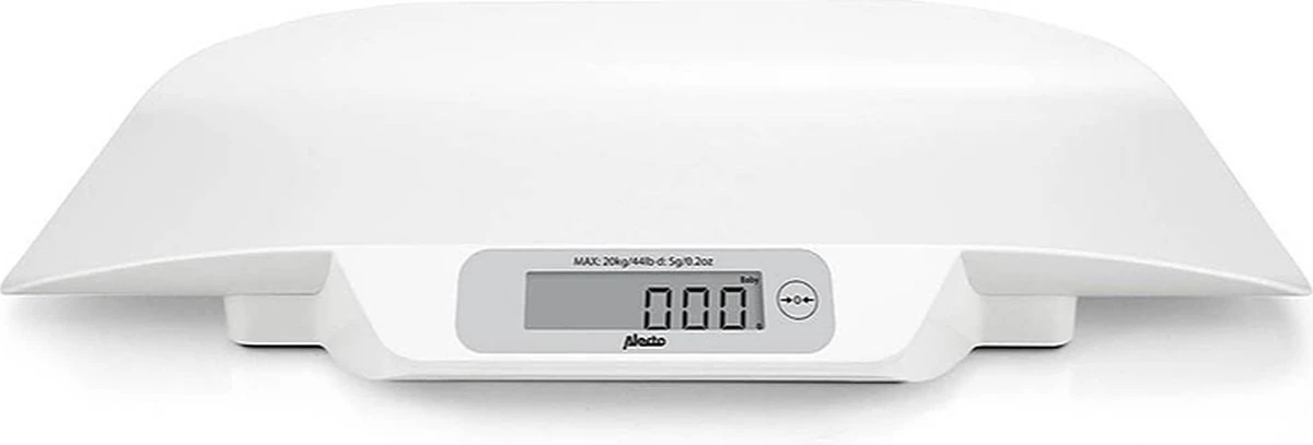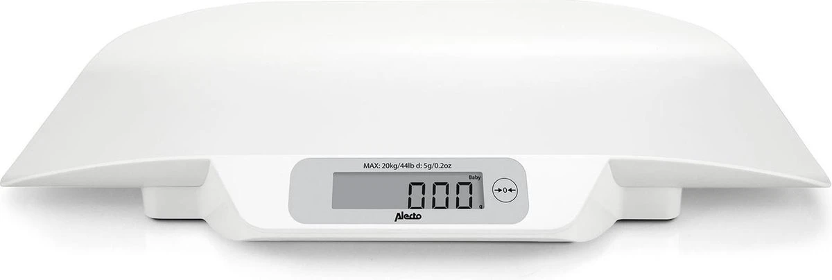 - De babyweegschaal weegt tot maximaal 20 kilogram en is tot op 5 gram nauwkeurig.