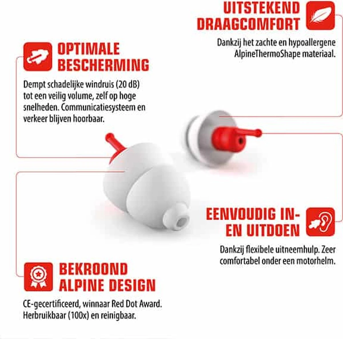 Alpine Hearing Protection heeft de Red Dot Award in de wacht gesleept voor het ontwerp van haar MotoSafe oordoppen. De jury van deze prestigieuze designprijs roemde de “hoogstaande kwaliteit en het innovatief vermogen” van de oordoppen.