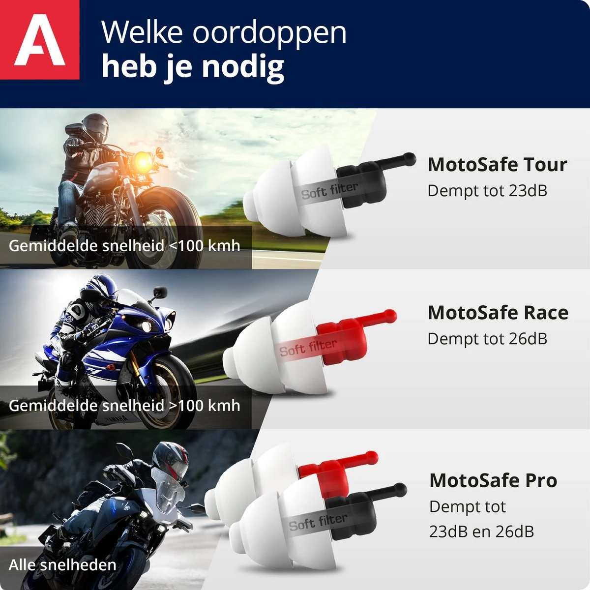 MotoSafe® Pro is een combinatie pakket van de MotoSafe Race en MotoSafe Tour. Verkeer, navigatie, intercom en de motor zelf blijven voldoende hoorbaar dankzij de innovatieve AlpineAcousticFilters™. Alpine MotoSafe® is verkrijgbaar in verschillende uitvoeringen met bescherming aangepast aan het gebruik. Racen op het circuit vereist meer bescherming dan bijvoorbeeld toeren.