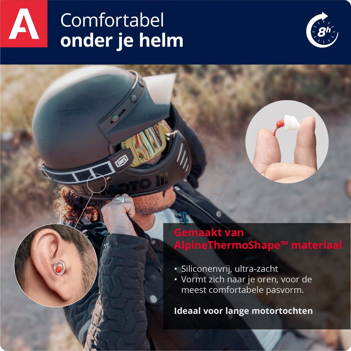 Alpine MotoSafe oordoppen zijn gemaakt van speciaal thermoplastisch materiaal. Door de warmte van het oor vormt het zachte materiaal zich naar de gehoorgang. Hierdoor zit de oordop altijd perfect. Dit in combinatie met de zachte filters maken dat de oordoppen perfect onder een helm zitten. AlpineThermoShape bevat geen siliconen, waardoor de oordoppen niet zweten, jeuken of irriteren. Je kunt ze probleemloos de hele dag dragen. MotoSafe oordoppen zijn voorzien van een unieke Minigrip. Met dit handige aanpakje kun je nog eenvoudiger de oordoppen uit je oren halen. De Minigrip is klein, onopvallend en gemaakt van flexibel en zacht materiaal.