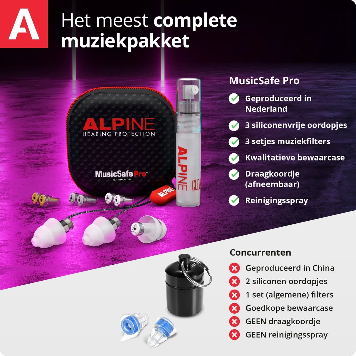 Alpine MusicSafe Pro wordt standaard geleverd met een handig etui om de oordoppen en filters netjes in te bewaren. Het etui is bovendien gemakkelijk aan een sleutelbos te bevestigen. Daarnaast zit er in elke verpakking een draagkoord. Je kunt de oordoppen daar aan bevestigen. Handig als je de oordoppen even uit wilt doen. De oordoppen zijn snel en makkelijk schoon te maken met de meegeleverde Alpine Clean, een desinfecterende reinigingsspray (5 ml). Regelmatig reinigen verlengt de levensduur.