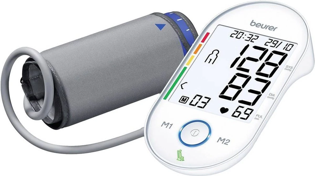Met de Beurer BM55 volautomatische bloeddrukmeter meet je heel eenvoudig de bloeddruk en hartslag via de bovenarm. Lees na de meting de waarden af van het wil verlichte XL display.