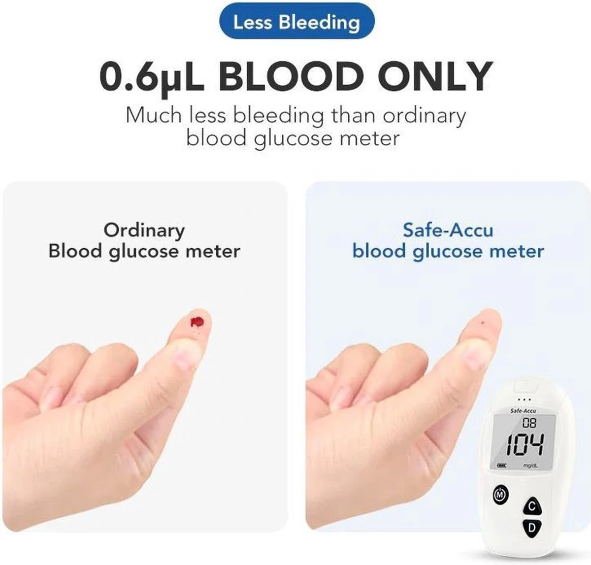 De teststrips hebben slechts een heel klein monster nodig om de bloedsuikertest uit te voeren – slechts 0,6 l bloed. Praktisch pijnloos en helpt effectief huidbeschadiging te minimaliseren.
