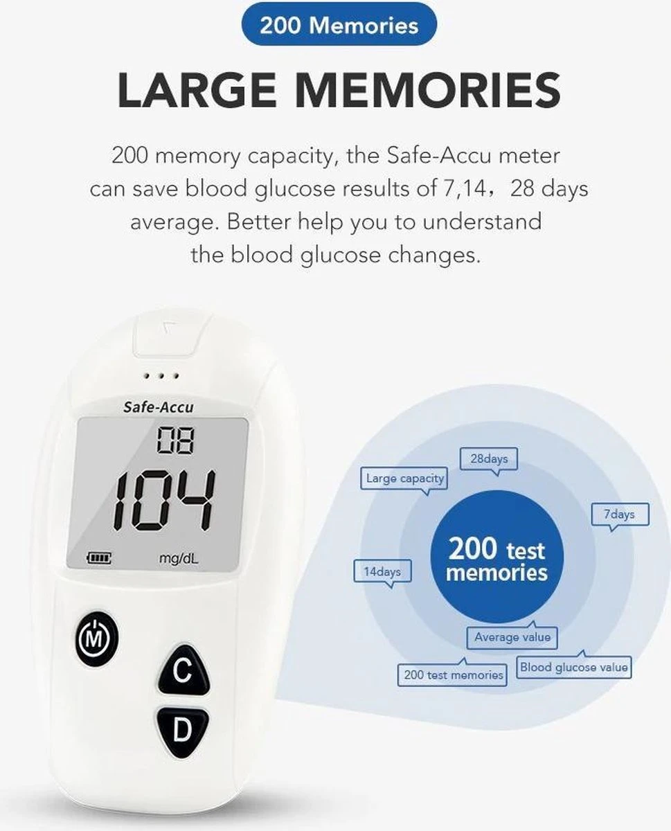 De bloedglucosemeter is handig door het kleine formaat en de mogelijkheid om 200 metingen op te slaan in het apparaat. Hierdoor kunt de metingen over een aantal weken met elkaar vergelijken om meer te weten te komen over uw bloedglucose niveaus. Ook kunt u de tijd en datum instellen. De eenheid die het apparaat gebruikt is (mg/dL).