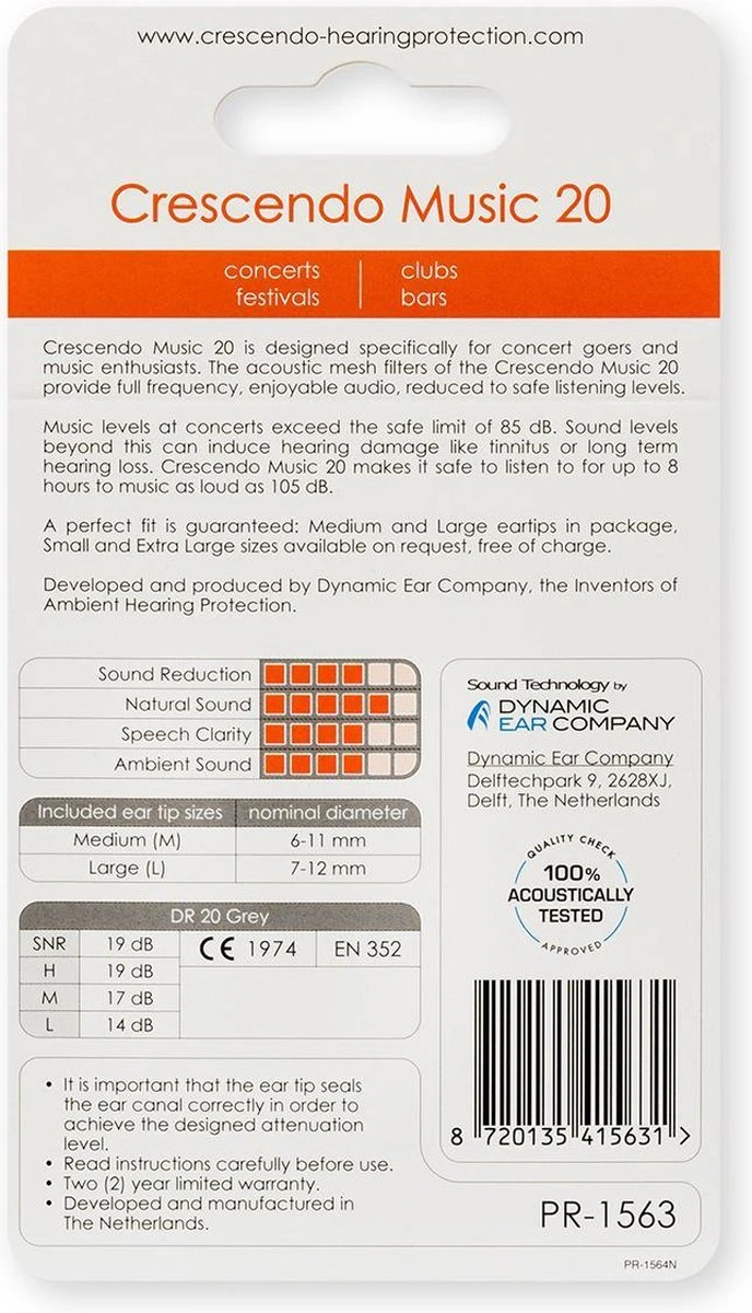 Crescendo Music is herbruikbare gehoorbescherming met universele pasvorm, speciaal ontworpen voor muzikanten en muziekliefhebbers. Terwijl andere gehoorbescherming dof en onnatuurlijk kan klinken, reduceren de filters van Crescendo Music het geluid naar een veilig en prettig niveau over het gehele frequentiebereik. Het geluidsniveau van muziek op concerten overschrijdt over het algemeen het veilig geachte niveau van 85dB. Boven dit niveau is er een sterk toenemende kans op (blijvende) gehoorschade zoals oorsuizen en overgevoeligheid voor geluid. Crescendo Music reduceert het geluidsniveau met 20 dB. Dit maakt het veilig om tot acht uur lang naar muziek tot een geluidsniveau van 105 dB te luisteren. Het geavanceerde membraanfilter, ontworpen door Dynamic Ear Company, zorgt voor een vrije luchtdoorgang naar het oor. Dit minimaliseert het gevoel van afsluiting (vooral laagfrequent), terwijl het oor geventileerd blijft voor optimaal comfort. Crescendo Music gehoorbescherming is hoofdzakelijk ontworpen voor bescherming tegen harde muziek, maar is ook geschikt als bescherming in alle andere lawaaierige omgevingen en voor industriële toepassingen.