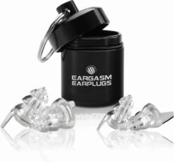 Eargasm set van 2 transparante muziekfilters, 1 set standaard oordopjes voor kleine tot normale oren, 1 set kleine oordopjes voor kleine oren, aluminium opbergkoker met sleutelring.
