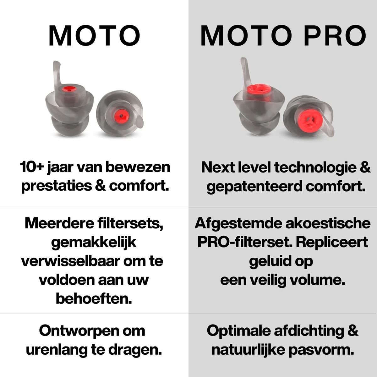 Nooit meer last van oorverdovend geluid op de motor. Geniet van comfortabele gehoorbescherming die niet alleen onzichtbaar is, maar ook nog driedubbele bescherming biedt door de verschillende filters. Onze motor oordoppen zijn perfect voor als je zelf met de motor op pad gaat of tijdens motorsport events.