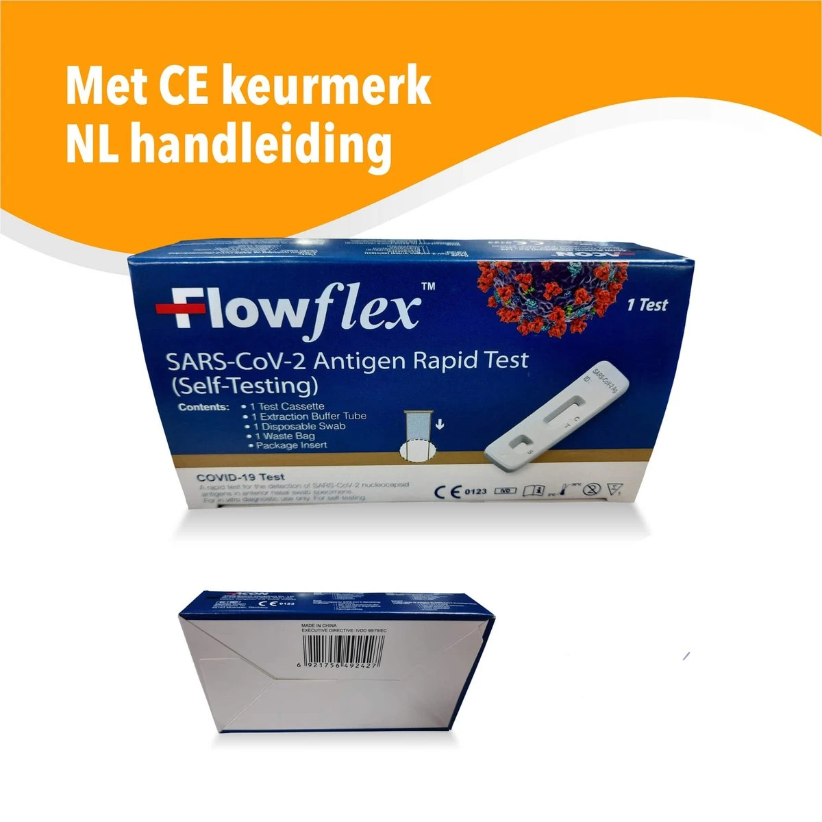 • Inhoud: 1 testcassette, 1 steriele swab, 1 flesje buffervloeistof