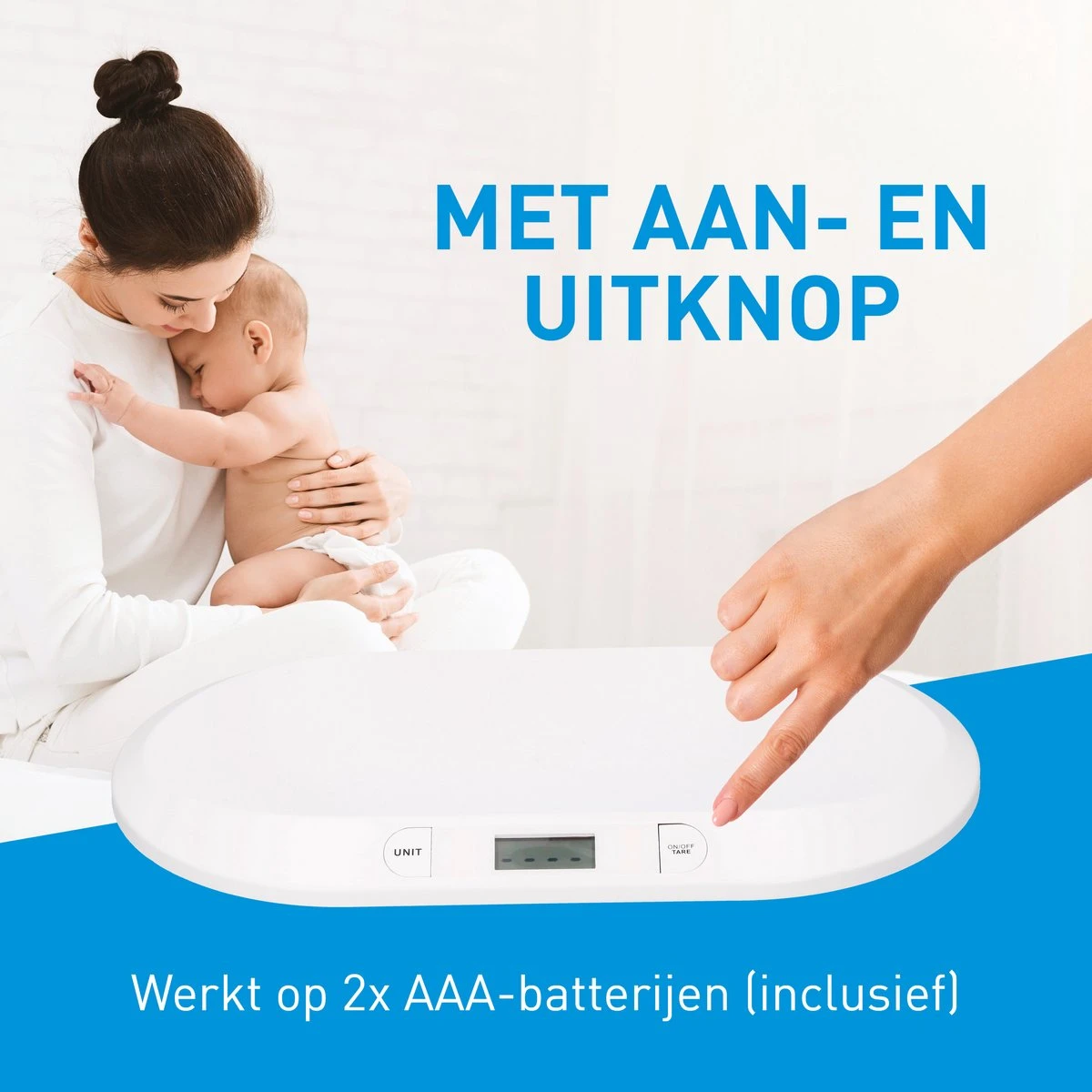 Een babyweegschaal verschilt van een gewone personenweegschaal. Dankzij het grote weegoppervlak leg je je baby rustig neer om het gewicht te meten. Op dit grote oppervlak kun je bovendien een dekentje leggen. De weegschaal heeft een tare-functie, waarmee je de stand weer op nul zet en de deken niet meeweegt. Is je kindje wat ouder? Dan kan het zelf op de weegschaal zitten. De weegschaal is 55 centimeter breed, 32,5 centimeter lang en slechts 3,5 centimeter hoog. Je maakt hem gemakkelijk schoon met een zachte doek.