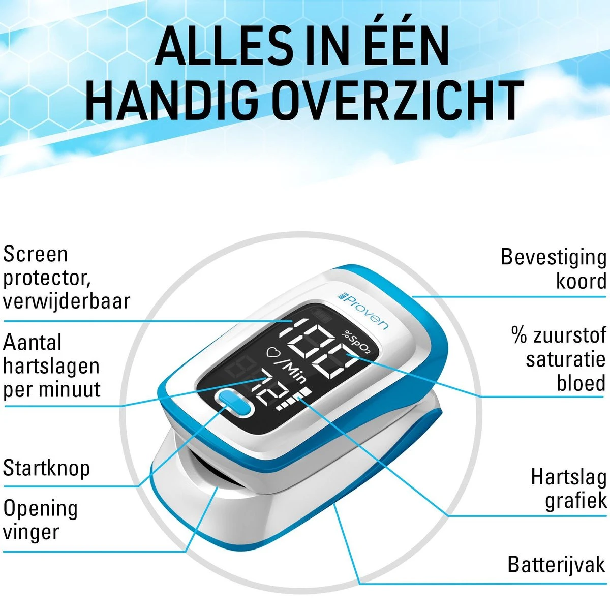 Bij de oximeter inbegrepen is een beschermhoes, batterijen, een keycord en quick start instructies.
