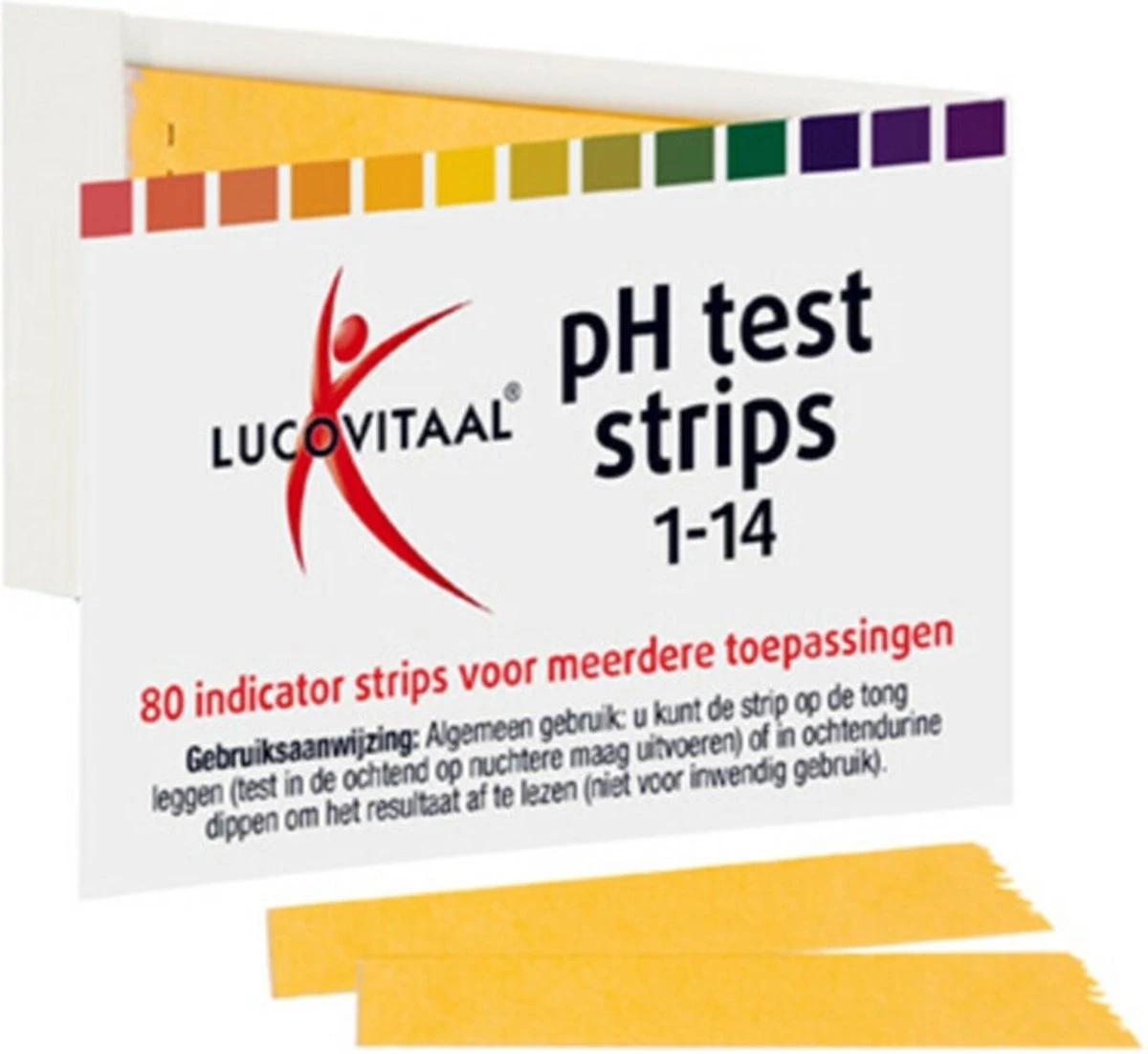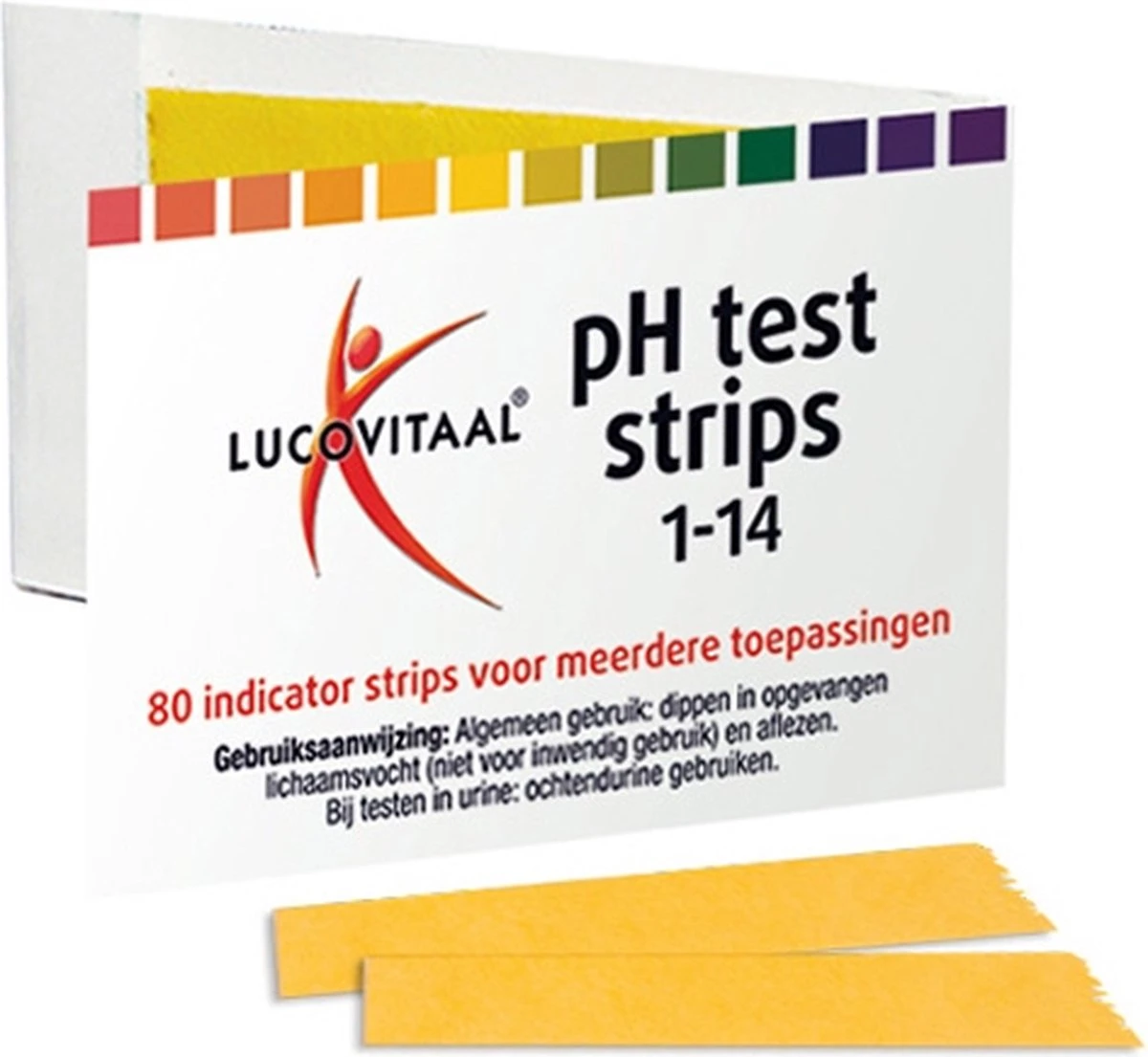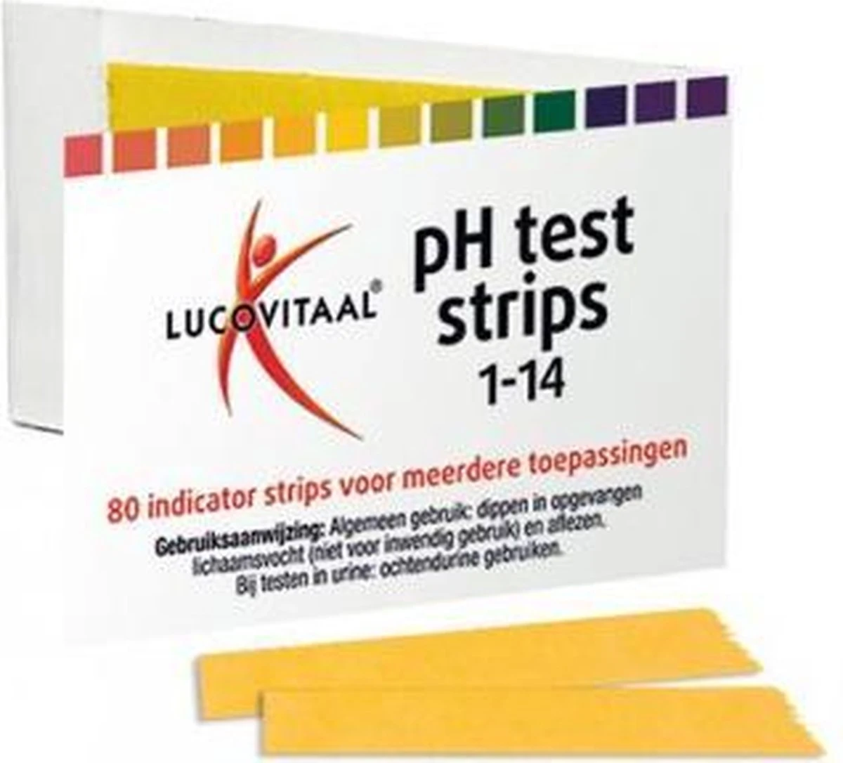Lucovitaal pH Test Strips. 80 indicator strips voor meerdere toepassingen. De zuurgraad kan variëren van 0 tot 14. Een pH waarde van 7 is neutraal en weerspiegelt een goede zuur-base balans. Gebruik: Dippen in opgevangen lichaamsvocht (niet voor inwendig gebruik) en aflezen. Bij testen in urine: ochtendurine gebruiken.