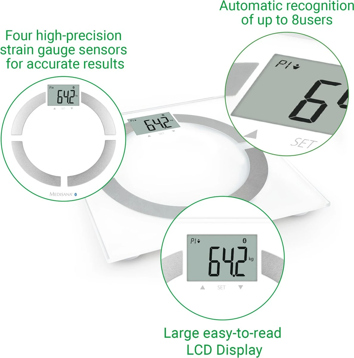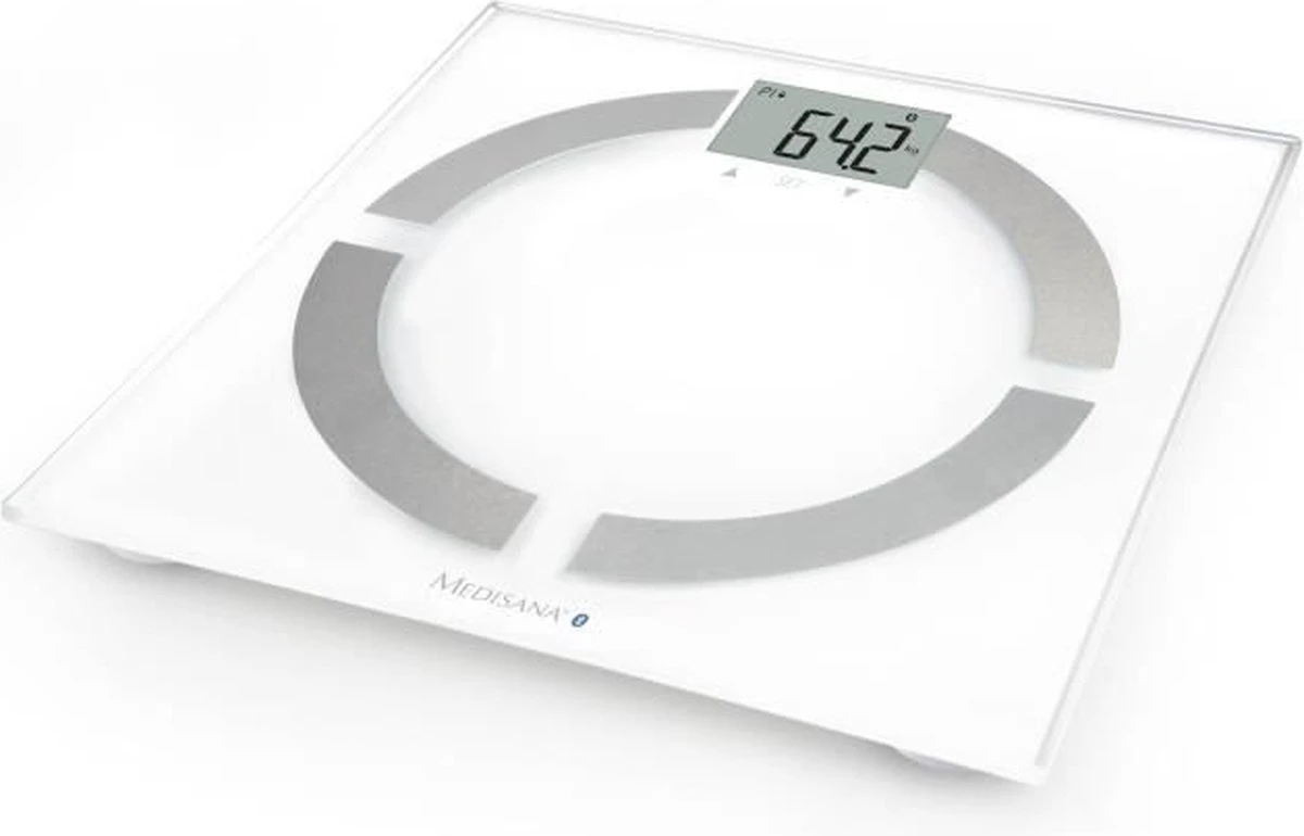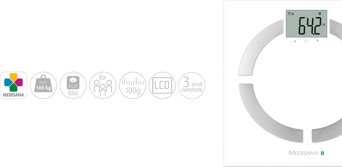 Op zoek naar een lichaamsanalyse weegschaal die meer meet dan alleen je geiwicht en bmi? Dan is de Medisana BS444 Connect Lichaamsanalyseweegschaal met app iets wat je zoekt! Naast lichaamsgewicht en BMI meet de BS 444 Connect ook je vetpercentage, vochtpercentage, en je spier- en botmassa. Samen met de BMI-berekening en vaststelling van de dagelijkse caloriebehoefte helpt deze Lichaamsanalyseweegschaal met app je naar een efficiënter gezondheidsschema.
