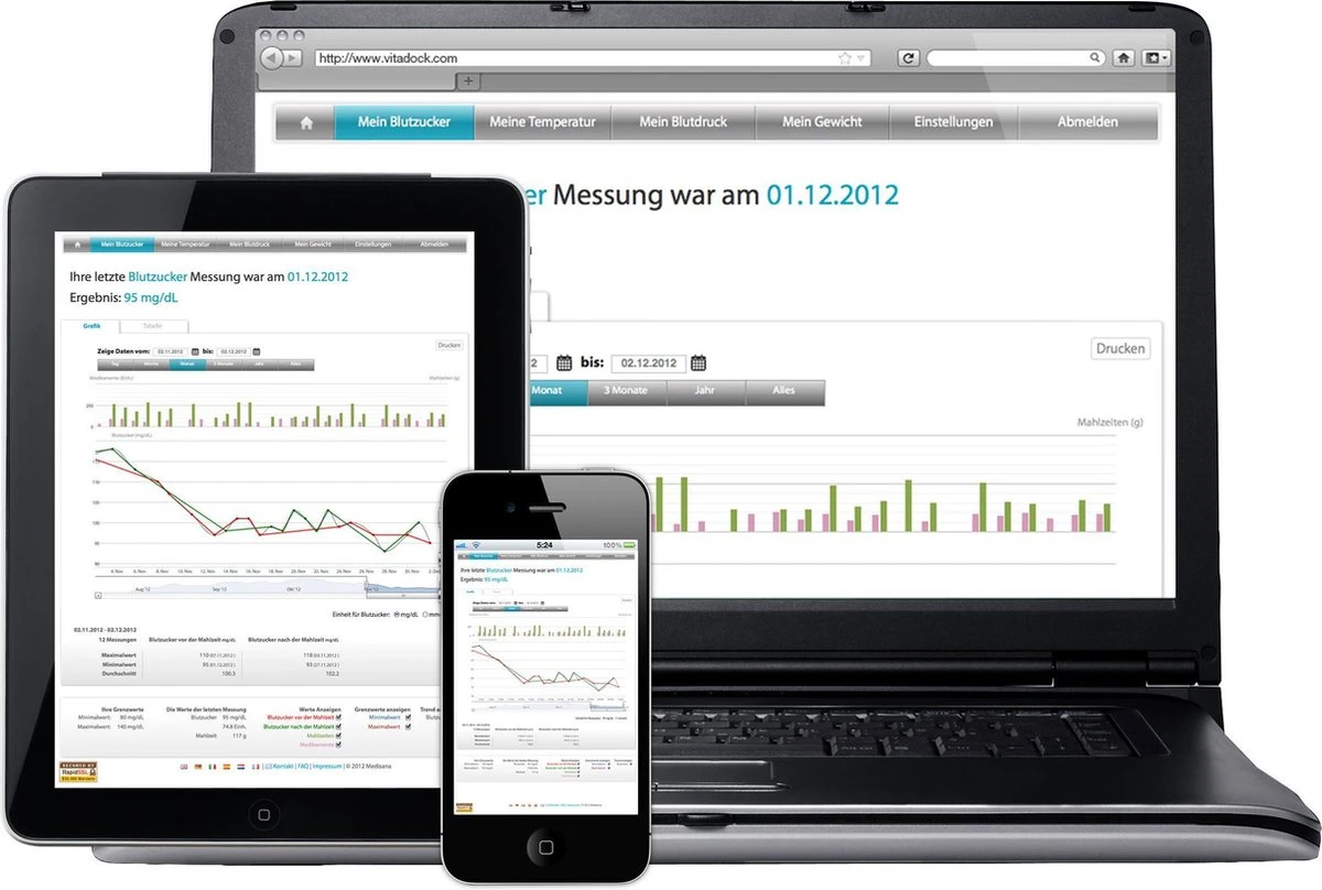 Zet uw bloedglucosegegevens eenvoudig over naar VitaDock® Online en ontdek de veelzijdige evaluatie en analysemogelijkheden.VitaDock® Online van Medisana® maakt het opslaan, opvragen, analyseren en exporteren van uw persoonlijke vitale gegevens zoals bloeddruk, bloedglucoseniveau, lichaamstemperatuur, gewicht of uw activiteit mogelijk. Bovendien kunt u uw online opgeslagen meetwaarden met de VitaDock® app op uw iPhone®, iPad® en iPod touch® en diverse Android toestellen synchronisieren zodat u altijd uw gegevens binnen handbereik heeft.