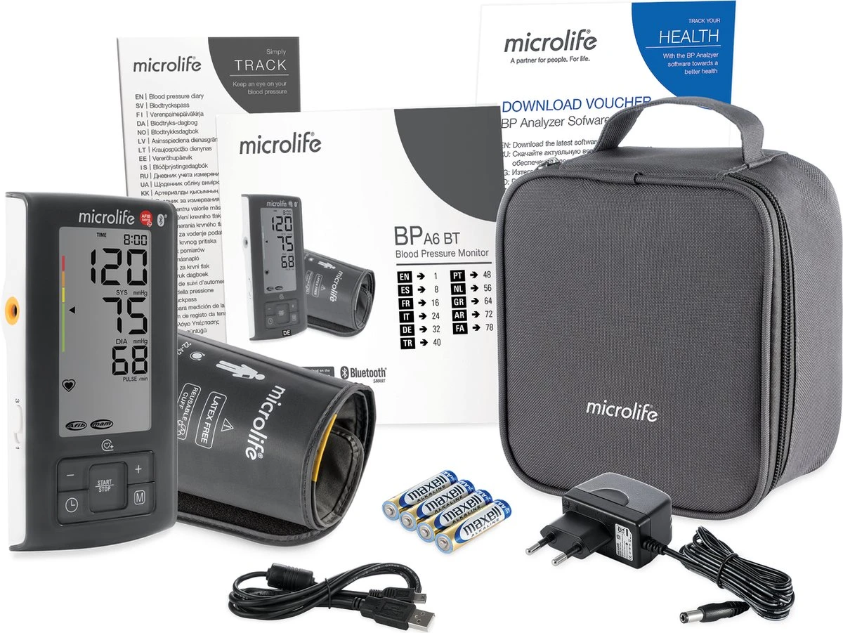 De Microlife BP A6 BT is een geavanceerde bloeddrukmeter voor thuis gebruik en klinisch gevalideerd. Met deze bloeddrukmeter is het mogelijk om via Bluetooth® 4.0 de metingen te exporteren naar de Microlife connected health app of naar de PC. Tevens beschikt de bloeddrukmeter over de zeer betrouwbare AFIB detectie (atriumfibrillatie), waardoor atriumfibrilleren vroegtijdig kan worden opgespoord. Het scherm is groot en duidelijk afleesbaar. Bovendien is het scherm voorzien van een WHO indicator en de MAM functie, waarbij automatisch 3 metingen worden gedaan waarvan vervolgens het gemiddelde wordt weergegeven.