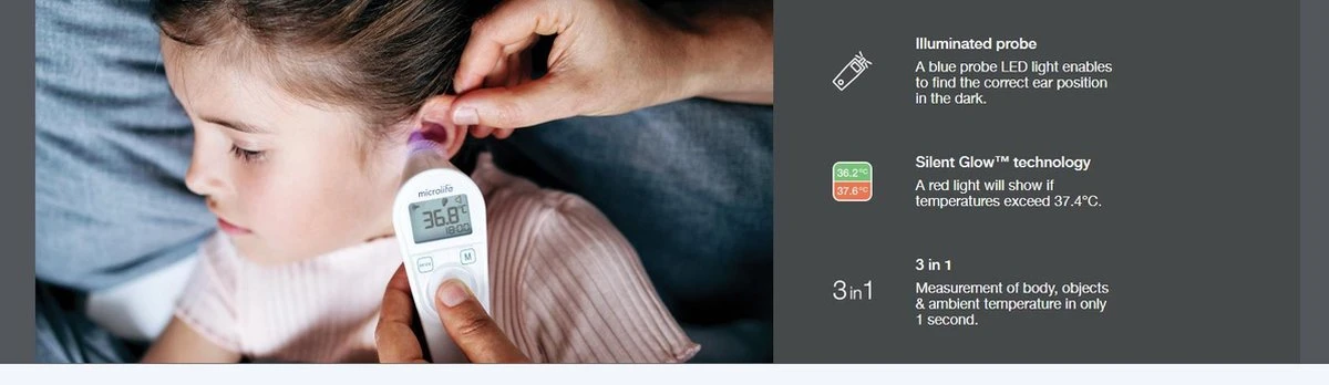 Het ACCUsens-geleidingssysteem maakt het gemakkelijk om de goede positie in het oor te vinden. U kunt het bijvoorbeeld gebruiken om te checken hoe warm de flesvoeding voor uw kindje is of de temperatuur in het bad. Bovendien kunnen de 30 laatste metingen die u hebt gedaan worden teruggelezen. Snel, gemakkelijke, ergonomisch en voor verschillende doeleinden: