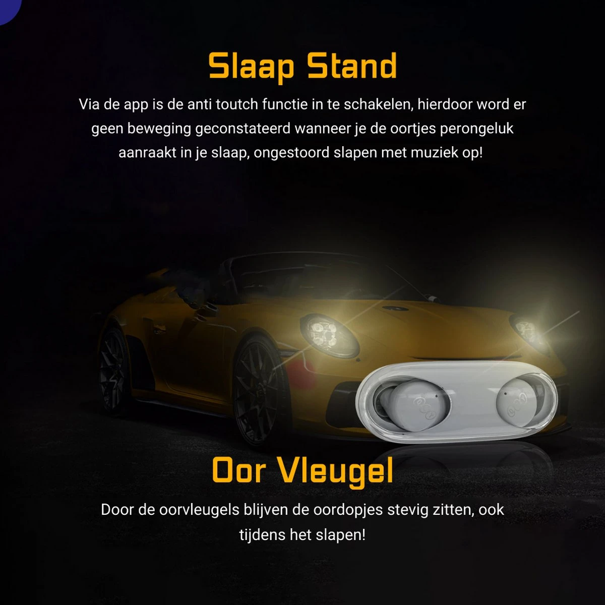 ● Anti Touch: Slaap jij af en toe met muziek op? Dan zijn ook deze oortjes voor jou! Via de app is de anti toutch mode aan te zetten die ervoor zorgt dat wanneer het oortje een drukbeweging detecteert er niks gebeurd met de muziek zodat jij ongestoord kan slapen!