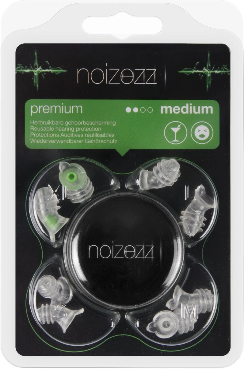 De Noizezz Green Medium gehoorbescherming heeft het medium filter met een demping tot 24 dB. Deze Noizezz gehoorbescherming kan worden gebruikt om de oren te beschermen bij onder andere uitgaan (disco/dancing/concerten), voor horeca personeel, leerkrachten in sportzalen, zwembaden en kindercrèches. Het unieke filter behoudt de spraakverstaanbaarheid en essentiële waarschuwingsgeluiden. Comfortabel door de perfecte pasvorm van de oordoppen. Wordt standaard geleverd met 4 maten S, M, L en XL in de verpakking.