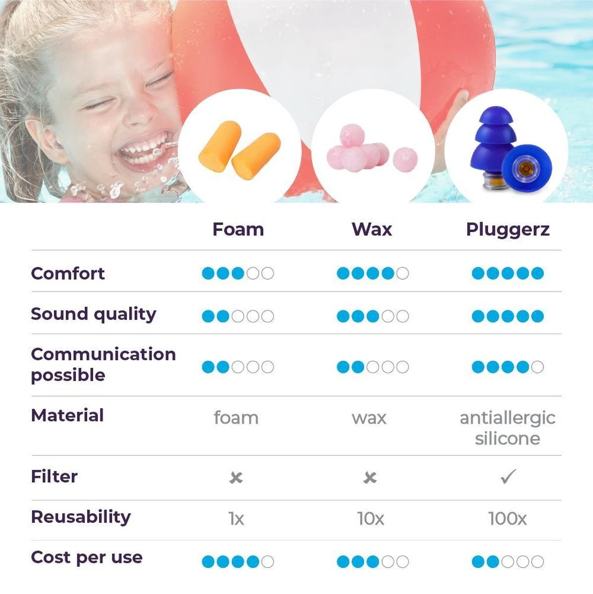 De Pluggerz earplugs Water Uni-Fit zijn herbruikbare zwemoordoppen. Heb je last van je oren tijdens het zwemmen of douchen en wil je je gehoorgang watervrij houden? Dan zijn de Uni-Fit Water oordoppen een goede keuze. De oordopjes beschermen in een lawaaierig zwembad ook nog eens tegen gehoorbeschadiging.