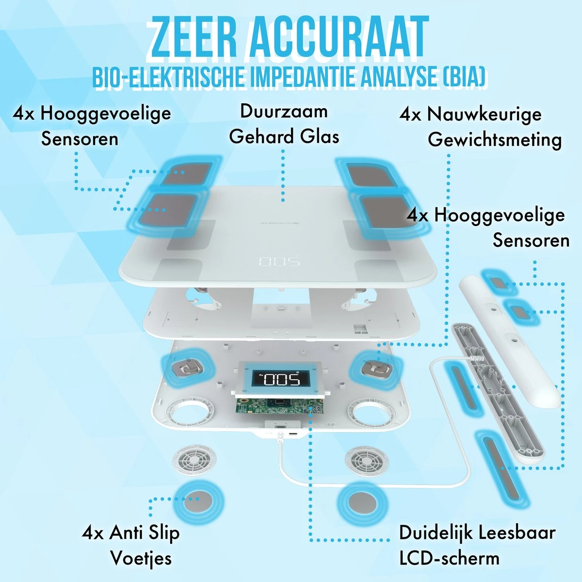 - 8 sensoren (in plaats van 2 of 4 zoals meeste smart scales)