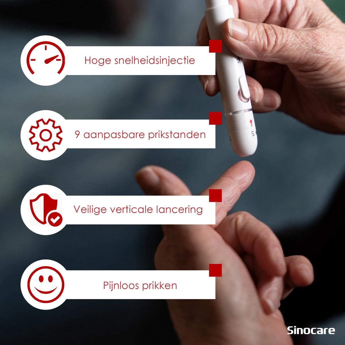Pijnloos prikken is wat de sinocare prikpen doet! De pen zit vol met opties om het voor u zo prettig mogelijk te maken. De hoge snelheidsinjectie zorgt ervoor dat u niks door heeft van de prik. U kunt zelf kiezen uit negen aanpasbare prikstanden, hierdoor zit er altijd een prettige prikstand tussen voor u! De verticale lancering zorgt ervoor dat u altijd veilig kunt prikken.