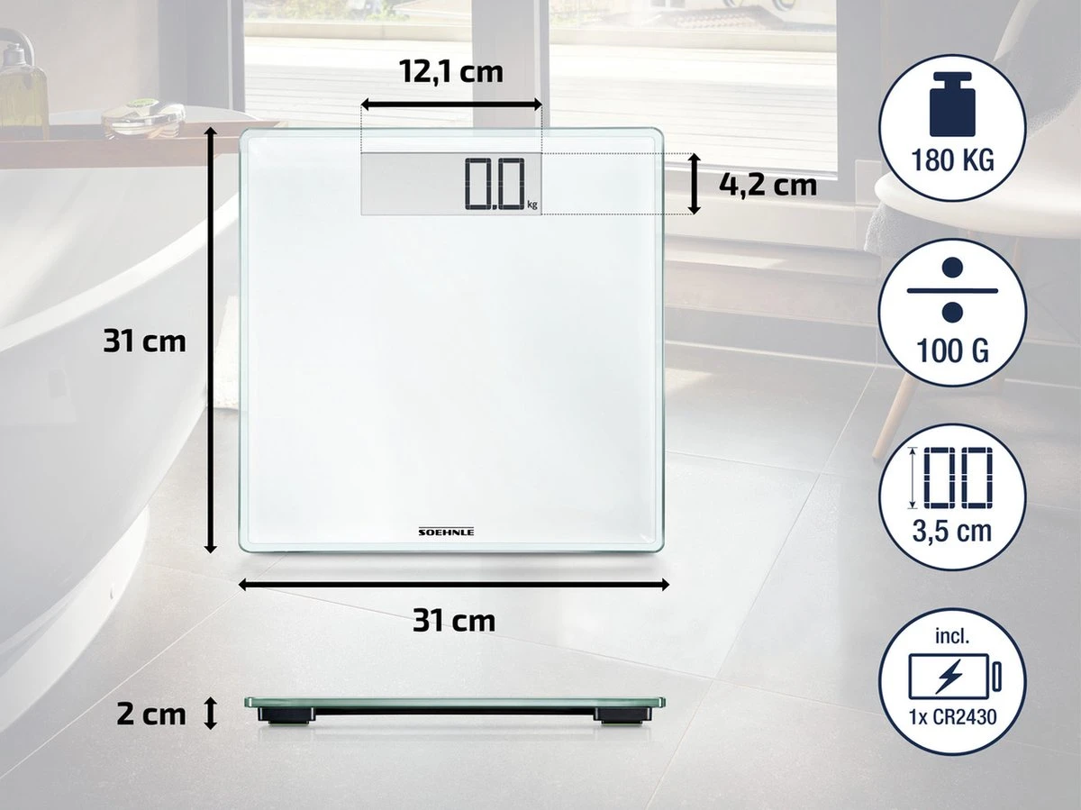 Een weegschaal met persoonlijkheid! Digitale personenweegschaal Style Sense Comfort 100 straalt kwaliteit uit: elegant design in wit, hoogwaardige techniek, functionaliteit en comfort. Met zijn grote cijfers is het lcd-display gemakkelijk af te lezen.