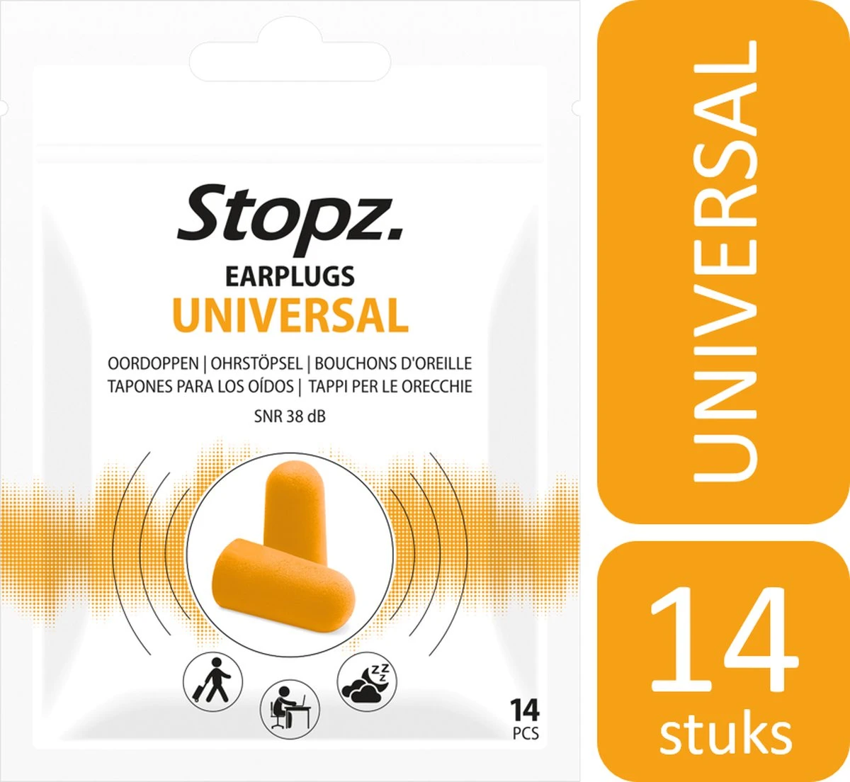 Stopz. Universal oordoppen hebben een hoge dempingsfactor. Ze dempen geluiden tot aanvaardbare niveaus tijdens het slapen, werken, op evenementen of op reis.