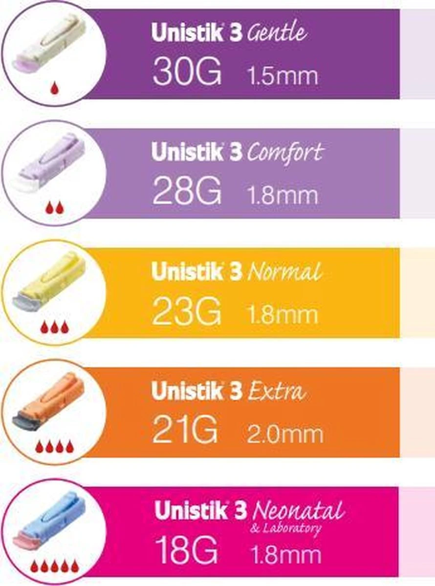 Dit is de Unistik 3 veiligheidslancet Comfort. De Unistik veiligheidslancetten van Owen Mumford bestaat uit een reeks van 5 lancetten waarvan dit de gemiddelde afmeting is. Deze veiligheidslancet is ontwikkeld om de bloedafname voor bijvoorbeeld het testen van bloedglucose zo comfortabel mogelijk te maken. Deze veiligheidslancet is eenvoudig te gebruiken en neemt vele voordelen met zich mee tijdens de bloedafname ten opzichte van andere lancetten. Alle unistick veiligheidslancetten voldoen aan de eisen die aan een veilig naaldsysteem worden gesteld en geven veel controle tijdens het prikken.