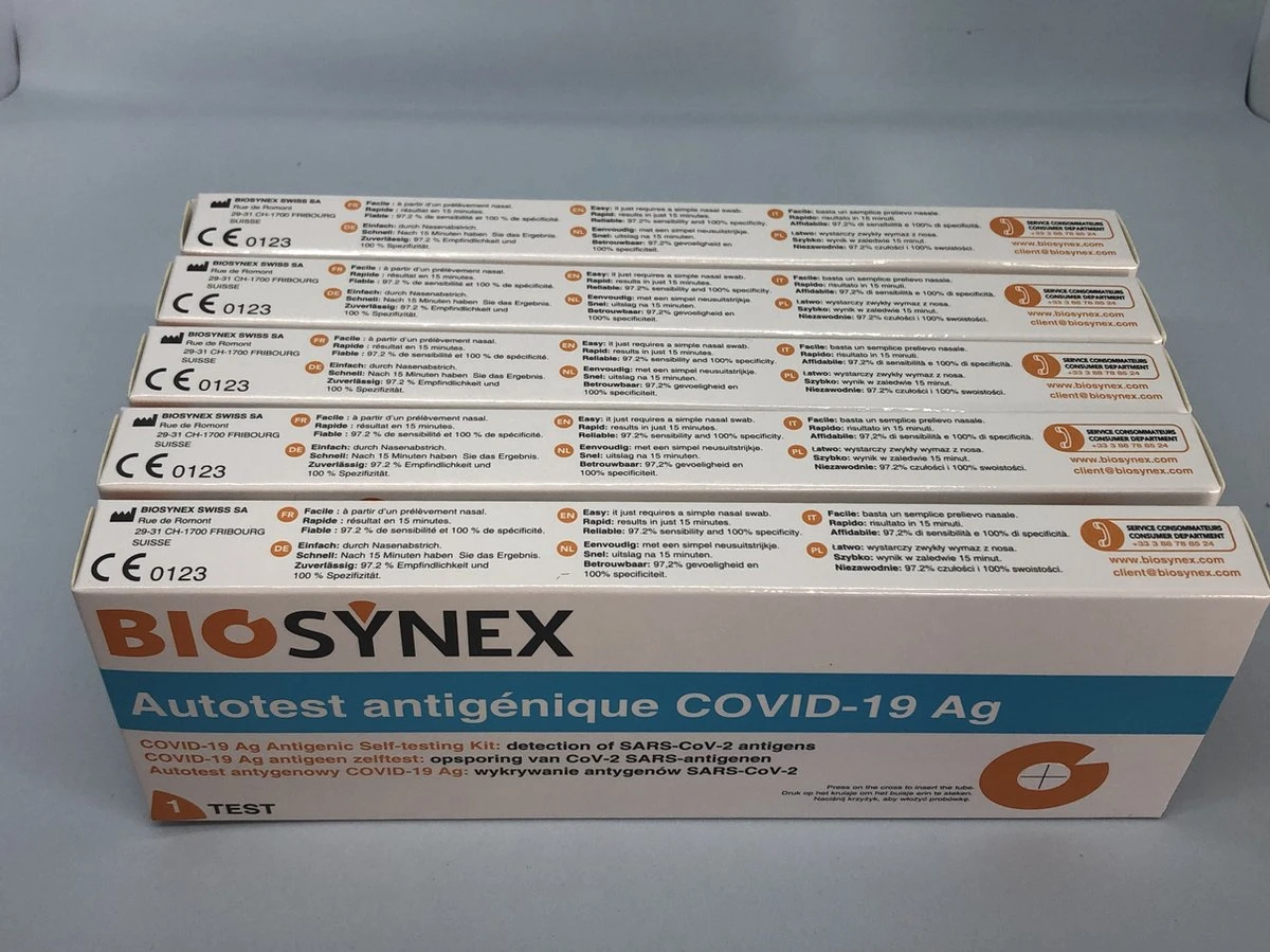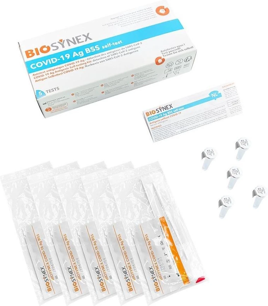 De Biosynex COVID-19 Ag BSS zelftest is een in-vitro immunochromatografische sneltest voor de kwalitatieve opsporing van SARS-CoV-2 nucleocapsid (N) proteïne-antigenen d.m.v. een neusuitstrijkje vooraan in de neus. De zelftest heeft een specificiteit van 100% en een gevoeligheid van 97,2%.
